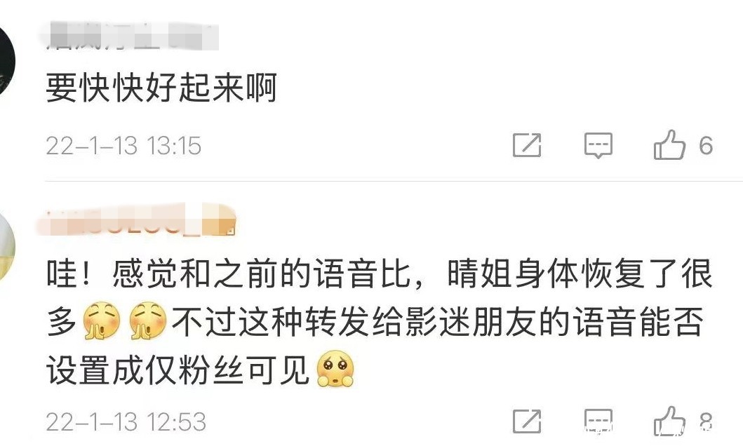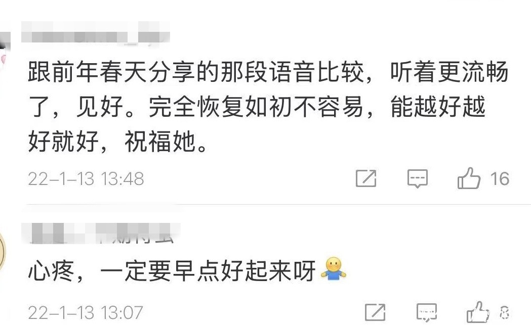 这段声音成为她为数不多的后期公开发声,令众多网友动容,纷纷留言祈福祝愿。