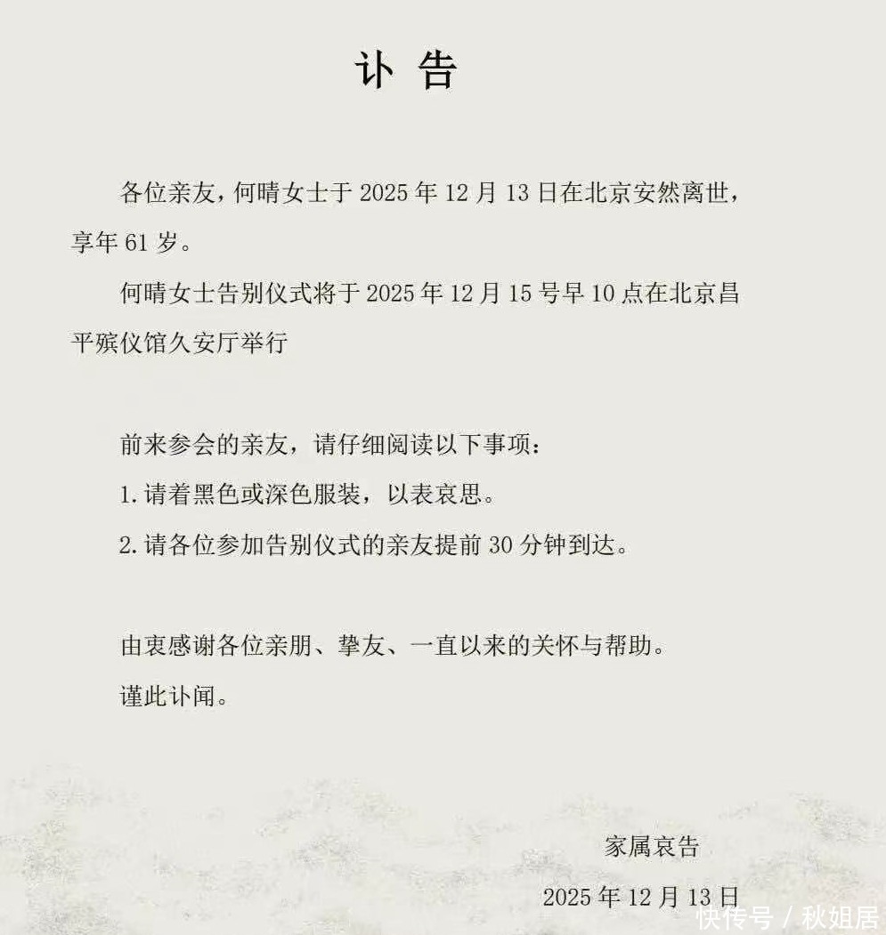 讣告内容公开显示,何晴的遗体告别仪式定日举行,亲友将送她最后一程。